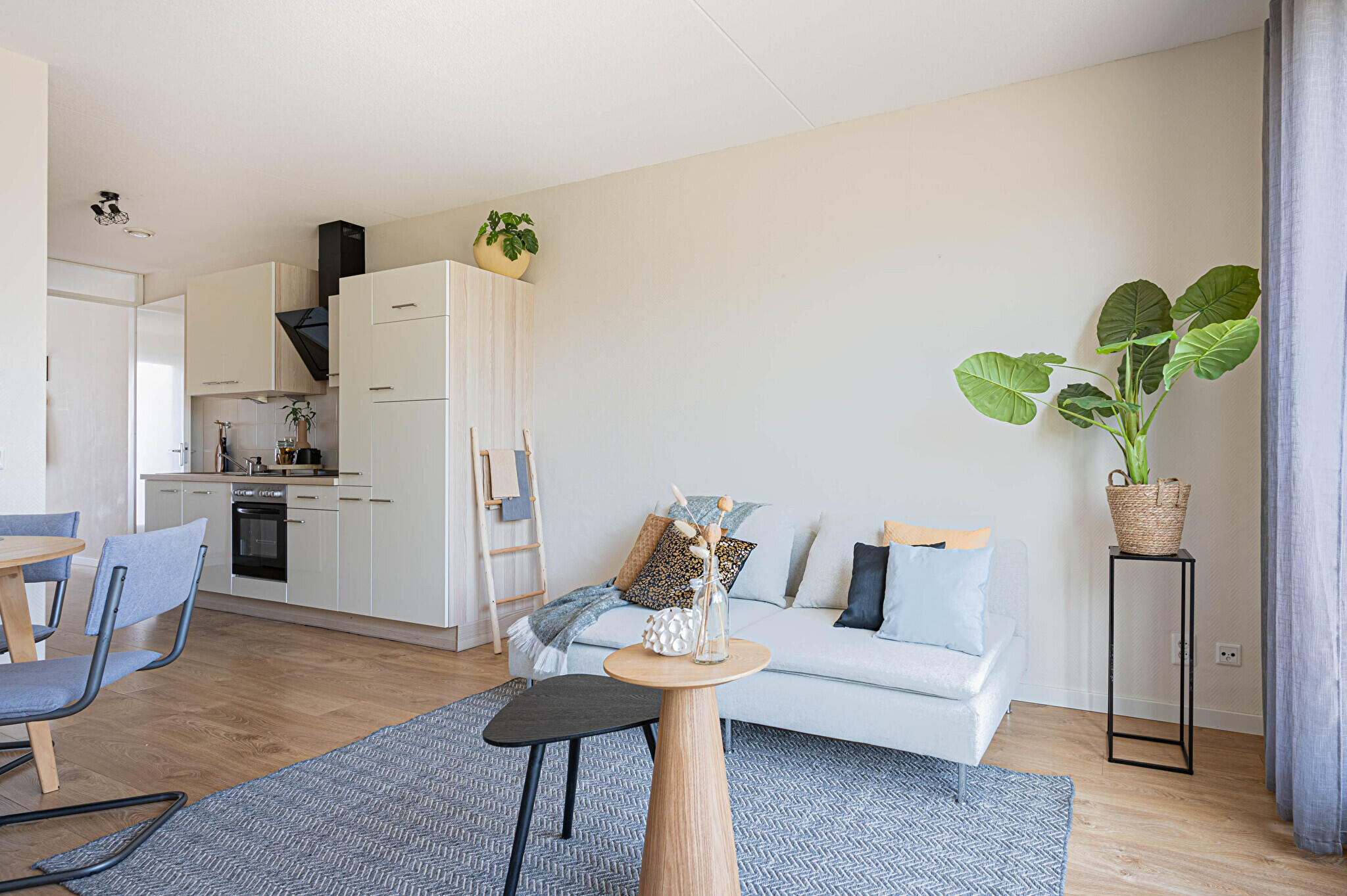 In dit kleine appartement hebben we de woning ruimtelijker laten lijken door de juiste inrichting. Geen kleine hoekjes en barrières, maar werken vanuit één geheel. Met het accessoirepakket voor keuken, woonkamer, badkamer en slaapkamer hebben we de woning een knussere sfeer gegeven. Het doel van de aankleding is dat de nieuwe bewoner bij binnenkomst geen beklemmend gevoel krijgt, maar juist ruimtelijkheid voelt en mogelijkheden ziet.